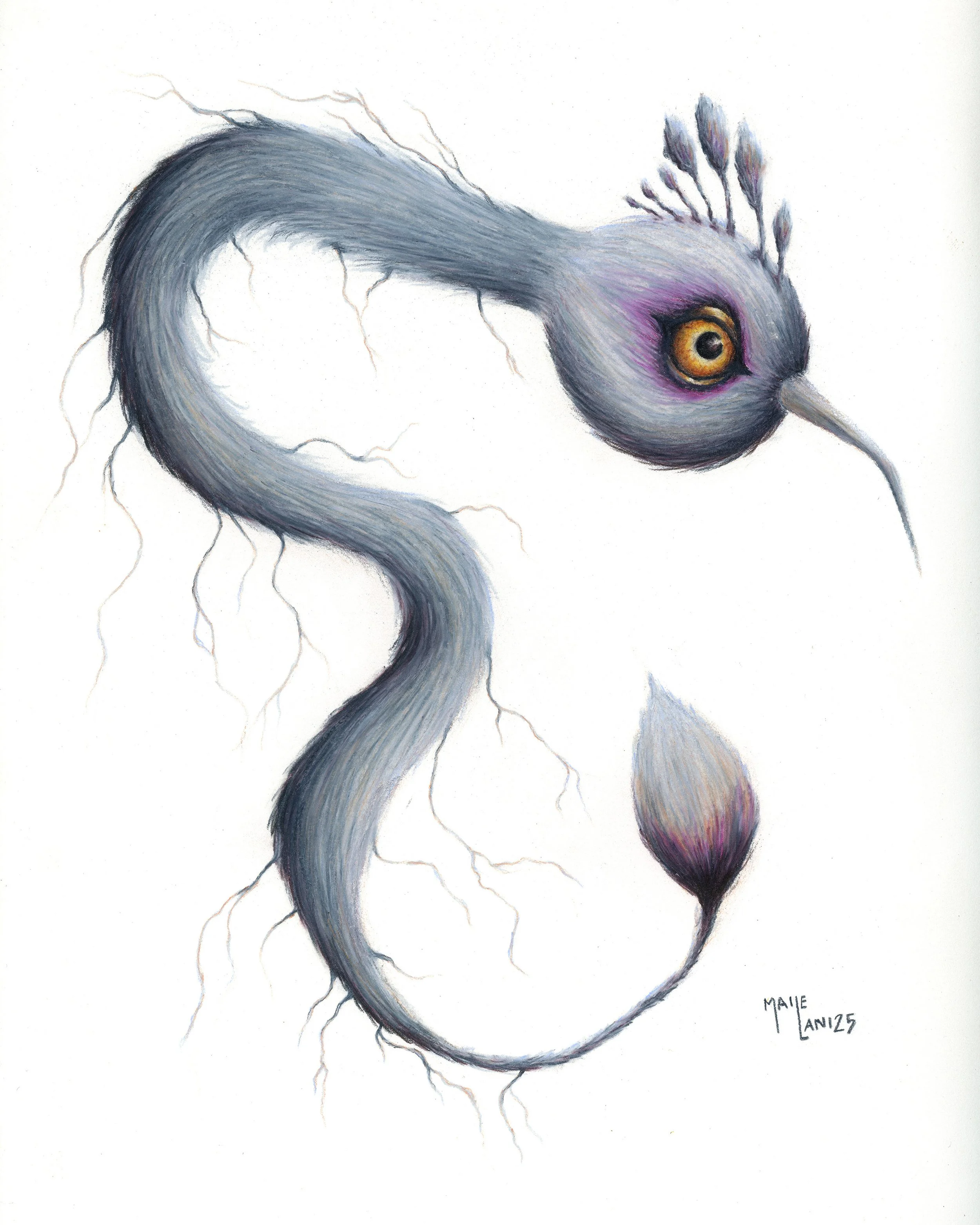 An ongoing series of alien and bird-like creatures rendered in colored pencil.